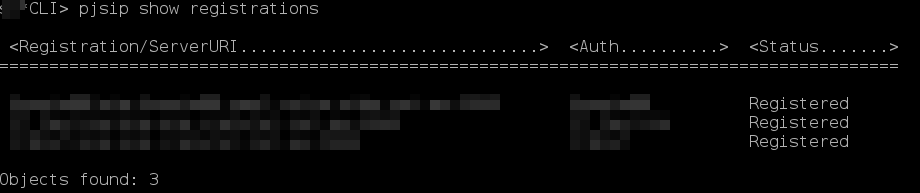 ~$ asterisk -rvvv CLI> pjsip show registrationsYou should see your trunks status, in this example my three trunks are all registered...
